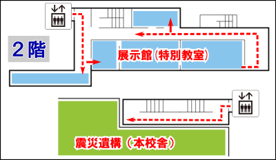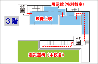 震災遺構門脇小学校は大きく2つに分かれています。一つは火災被害に遭った本校舎、もう一つは様々な展示が行われている展示館(かつての特別教室)です。2つの校舎は3階でつながっており、見学の順路は入口から火災被害の遭った本校舎を見学した後に3階で特別教室側に移動して映像上映や展示を見て受付に戻る流れとなります。