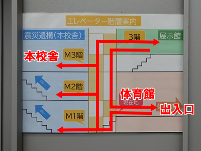 本校舎と展示館は高さの差がありますので。見学は本校舎エレベーターで出入口の(1階)からいったん下(M1階)に降りてから(M2階)(M3階)と本校舎を見学して(M3階)から(3階)に登り、展示館エリアに移動します。その後は展示館エリアのエレベーターで展示館の2階、1階へと見学しながら降りていく流れとなります。