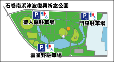 駐車場は3カ所あり、それぞれに車いす優先スペース、多目的トイレが設置されています。